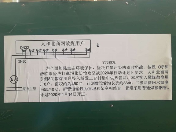 按照《呼和浩特市堅(jiān)決打贏污染防治攻堅(jiān)戰(zhàn)2020年行動(dòng)計(jì)劃》總體要求,該項(xiàng)目接入燃煤散燒用戶42戶,面積約2450平方米,其中一家村豐州路西34戶,2000平方米;人和北商網(wǎng)8戶,450平方米。該項(xiàng)目計(jì)劃敷設(shè)管線溝槽長度約174米,其中一家村豐州路西為88米,人和北商網(wǎng)為86米。新管道鋪設(shè)以直埋和架空相結(jié)合的方式,全部采用普通焊接鋼管,開工時(shí)間為2020年4月14日。