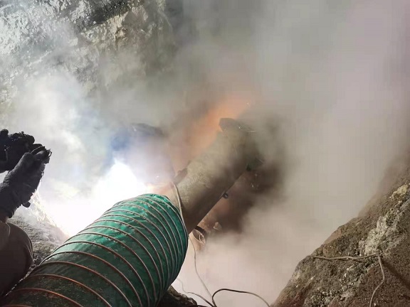 據(jù)悉,此次堵漏是將DN400的鋼管,上下一分為二,分為兩片,下面的部分加裝泄水閥,然后將上下合攏把原管道扣在里面,兩端用鋼板做內(nèi)徑250和外徑400的擋板,將泄露段整體包封在里面。水流從下部泄水閥泄走,不影響焊接,在整體焊接完,關(guān)閉泄水閥。